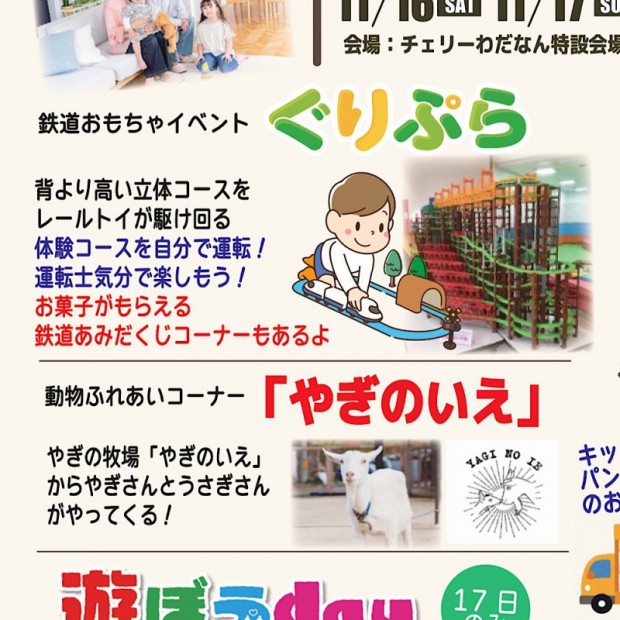 こどもに大人気のレールトイ「ぐりぷら」や、「やぎのいえ」の動物ふれあいコーナー、