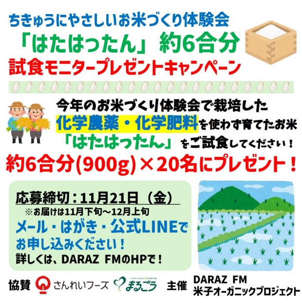 育てたお米は、化学農薬・化学肥料不使用の「はたはったん」という銘柄のお米です。